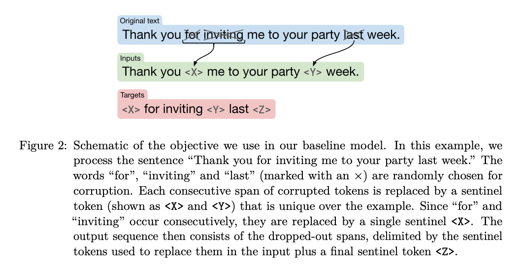 BERT는 Token단위로 Masking을 하는데 비하여 해당 논문은 span을 Masking하는 방식을 체택했다. 이러한 Mask Token은 Sentinel i토큰으로 Masking되고, 정답부분은 원래 Token이 들어가는 형태이다.